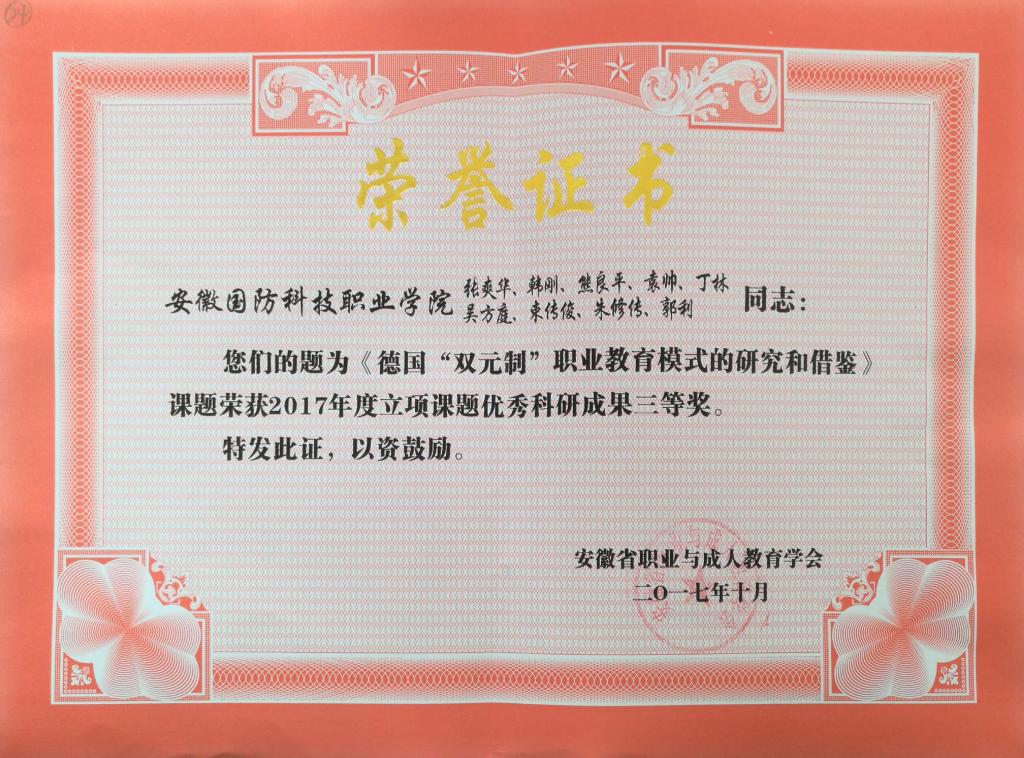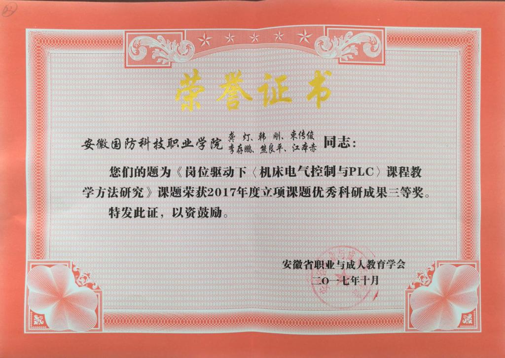 根据安徽省职业与成人教育学会近期发布的2017年度课题结题验收及优秀成果评选结果的通知(学会﹝2017﹞9号文),我校机械技术学院张爽华、龚灯两位老师主持的课题荣获优秀科研成果三等奖。