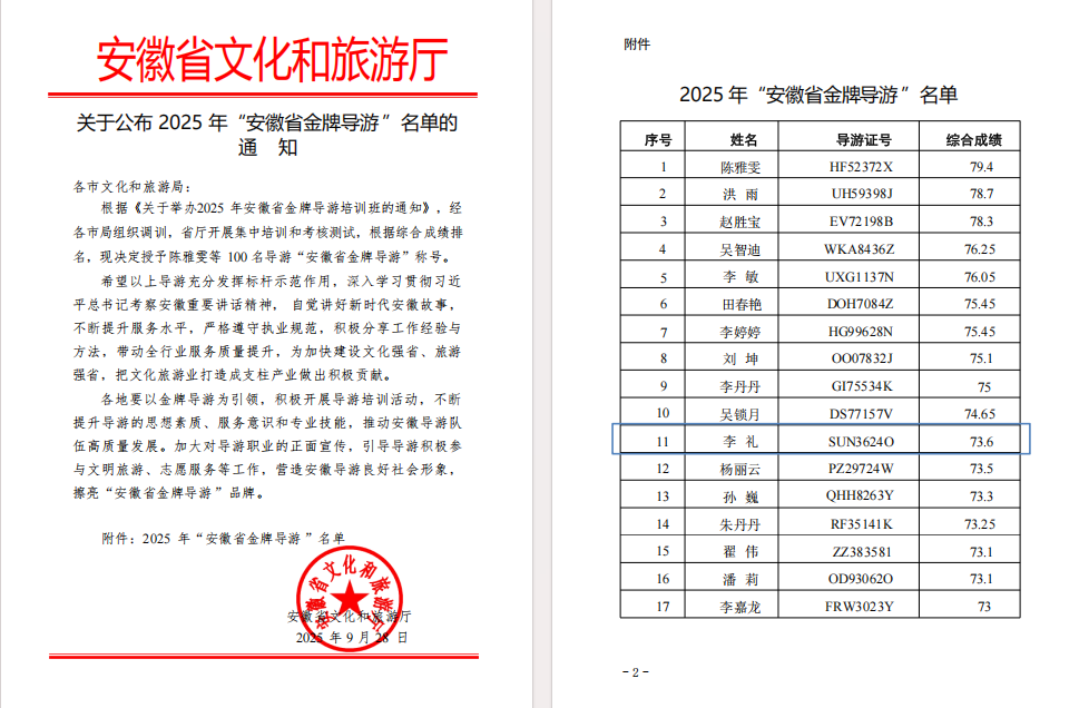 本网讯(经贸管理学院 张兰)近日,安徽省文化和旅游厅举办2025年安徽省金牌导游培训班。经过系统培训与严格考核,我校经贸管理学院李礼老师表现优异,在百名通过测试的学员中综合排名第11位,荣获“安徽省金牌导游”称号。